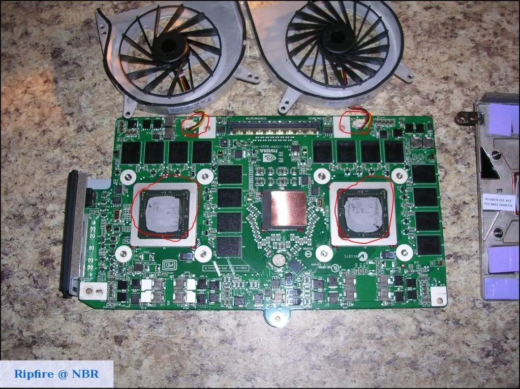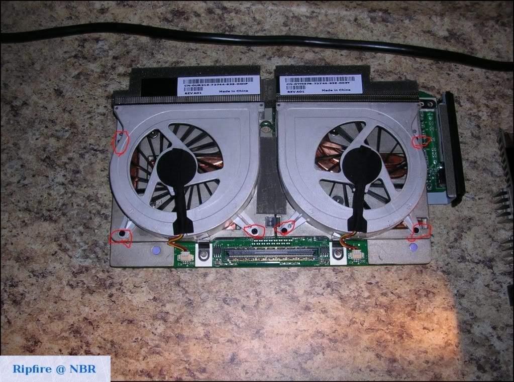 Back to the GPU, start by removing the 6 screws holding the fans on. Then flip them over, leave the cables on until you get the heatsink off, much easier to disconnect then.